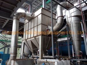 Die Masse des festen Materials wird durch einen Fütterer in den Flüssigkeitsbetttrockner eingespeist.Die gefilterte saubere Luft wird erhitzt und vom Bläser auf den Boden des fluidisierten Bettes geschickt und durch die Verteilungsplatte mit dem festen Material in Kontakt gebracht, um einen Flüssigkeits-Feststoff-Wärme-Massenaustausch zu bildenNach dem Trocknen des Materials wird es aus dem Entladesteller entladen.Die Abgase werden von der Oberseite des fluidisierten Bettes entladen und durch den Zyklonstaubkollektor und den Beutelfilter entladen, um das feste Pulver zurückzugewinnen.