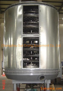 El material húmedo se alimenta continuamente a la primera capa de secado en la parte superior del secador.Será girado y agitado por rastrillos cuando el brazo rastrillo gira y caer hasta el borde exterior de la placa de secado grande a lo largo de la línea helicoidal exponencialEl material se desplazará desde la pequeña placa de secado hasta su borde exterior y caerá hasta el borde exterior de la gran placa de secado debajo.Tanto las placas de secado pequeñas y grandes se organizan alternativamente para que los materiales puedan pasar a través del secador continuamenteEl medio térmico puede ser vapor saturado, agua caliente o aceite térmico.Los materiales secos caerán de la última capa de la placa de secado al fondo del secador y luego se traslada por rastrillos a la salida de descarga. La humedad del material se eliminará de la salida de escape en la tapa superior. Para el secador de placas de tipo vacío, la humedad será aspirada por la bomba de vacío en la tapa superior.Los materiales secos se descargarán de la capa inferiorLa capacidad de secado puede mejorarse si el secador está equipado con dispositivos complementarios como un calentador con aletas, un condensador para la extracción de disolventes, un depurador de bolsas, un mecanismo de retorno y mezcla, un ventilador de corriente,y etc..